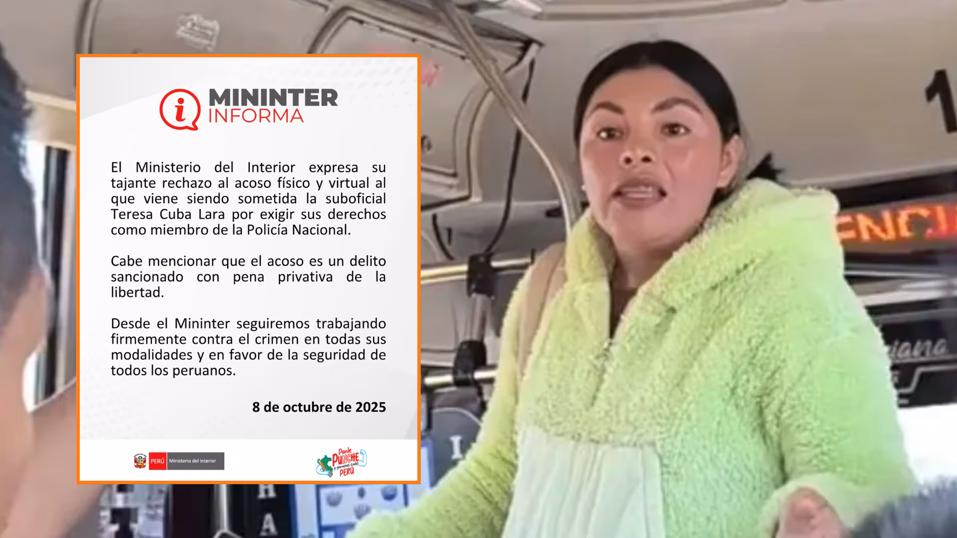 El Ministerio del Interior (Mininter) expresó su firme rechazo ante el acoso físico y virtual sufrido por la suboficial Teresa Cuba Lara, integrante de la Dirección de Turismo de la Policía Nacional del Perú (PNP), luego del incidente registrado el pasado 4 de octubre en un bus de transporte público del distrito de Magdalena del Mar. Según las investigaciones preliminares, el conductor de la unidad, identificado como José Villafuerte Alata, le negó a la agente el derecho de libre tránsito previsto en la Ley N.º 26271, que faculta a policías y militares a usar el transporte urbano sin pago alguno.
